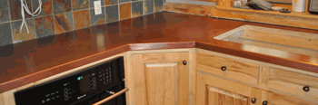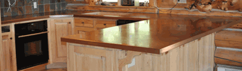 Handcrafted copper bar top paired with a custom crafted cabinet. We had the pleasure to work with some great folks from Idaho. He is a woodworker and wanted a custom copper bar top for his custom cabinet. As you can see from the photo’s there were some challenges in fitting this handcrafted copper bar top to the base. Two support beams lined each end of the cabinet as well as a decorative post on each end. Jim crafted the copper top to fit around each. Beveled edges add to the character of the handcrafted copper bar top and marries well with the cabinet below.